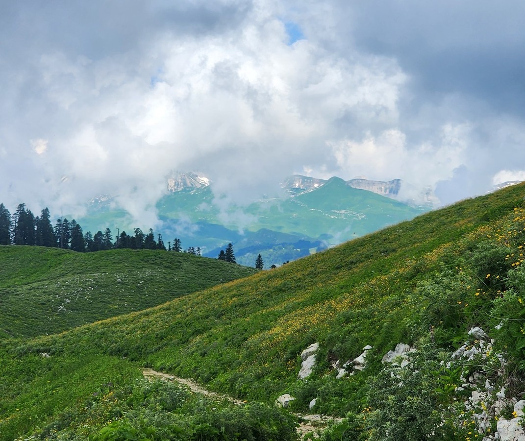 - Гора Мамдзышха (1873 метра над уровнем моря). Представьте себе, вдали раскинулись сочные луга и заснеженные горные вершины, мимо буквально на расстоянии вытянутой руки проплывают облака. Это невероятное ощущение до мурашек!