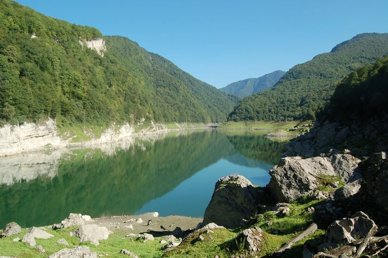 В 1891 году, в результате сильнейшего землетрясения было образовано озеро Амткел – второе по величине озеро Абхазии после знаменитой Рицы. У обрывистых берегов осенью и ранней весной бродят медведи, по вечерам озерную тишину тревожит лай шакалов, а в сумерках спускаются к воде дикие кабаны. Тут всё первобытно и дико. Окрестности озера – излюбленное место монахов-отшельников, которые укрываются здесь от суетного мира. Местные жители ходят сюда рыбачить, в озере водится форель, усач, быстрянка. Вдоволь насладившись видами и сделав фотографии, мы искупаемся в реке Джампал.