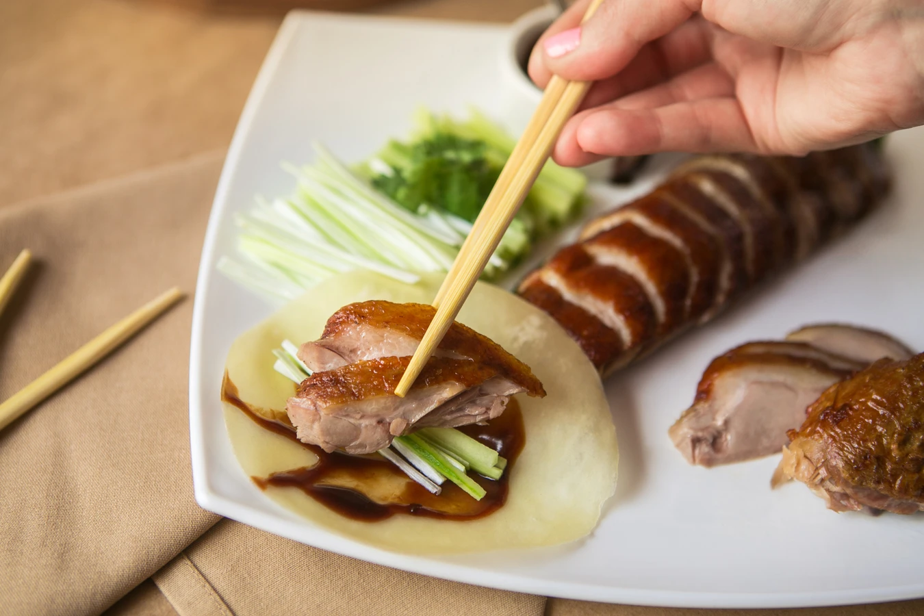 Далее на стол подадут целую утку по-пекински. Вы понаблюдаете за мастерством повара — по правилам, птица должна быть разделана на 108 кусочков. Мы поговорим об искусстве «правильного свёртка» и других тонкостях.