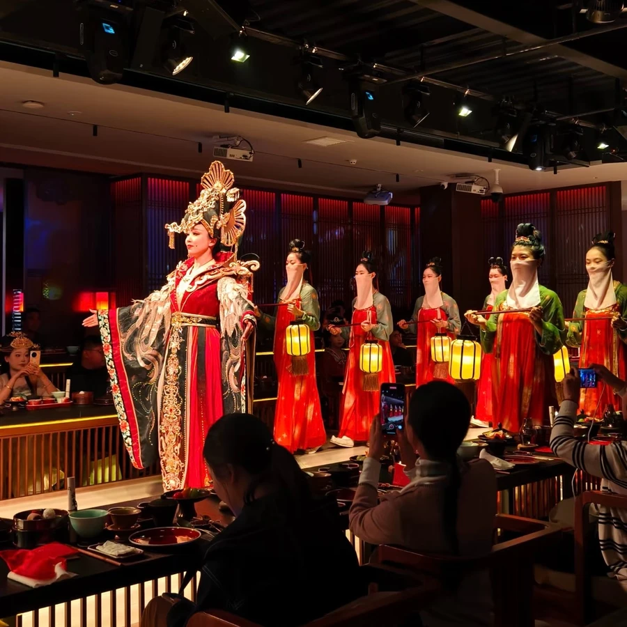 Императорский банкет и живые выступления. Вы отправитесь в большой банкетный зал, воссоздающий роскошь и атмосферу дворца династии Тан. И в течение 1,5 часов будете наслаждаться императорским банкетом, включающим тщательно подобранные блюда (10 подач), танцевальные номера, живую музыку и иммерсивные представления.