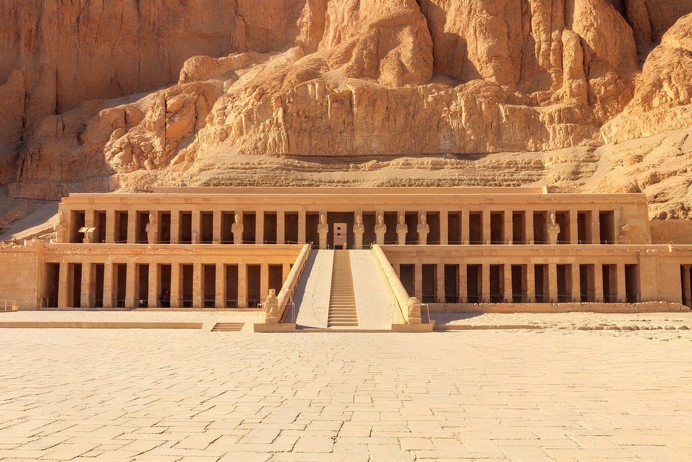 Уникальное архитектурное сооружение, словно вырастающее из основания отвесных скал. Один из самых впечатляющих памятников Древнего Египта.