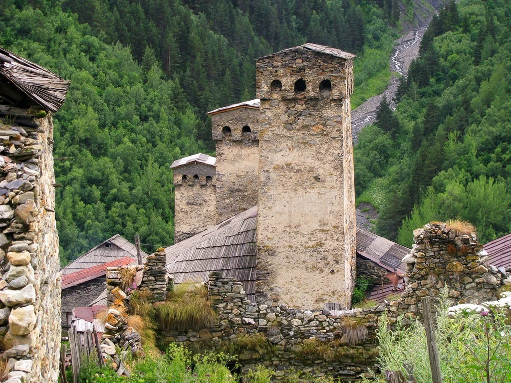 По тропе дойдём до горной деревни Цвирми, где мало что изменилось со времён Средневековья: пастухи выгуливают стада на лугах, крестьяне запасают сено и перевозят его на деревянных санях, запряжённых быками.