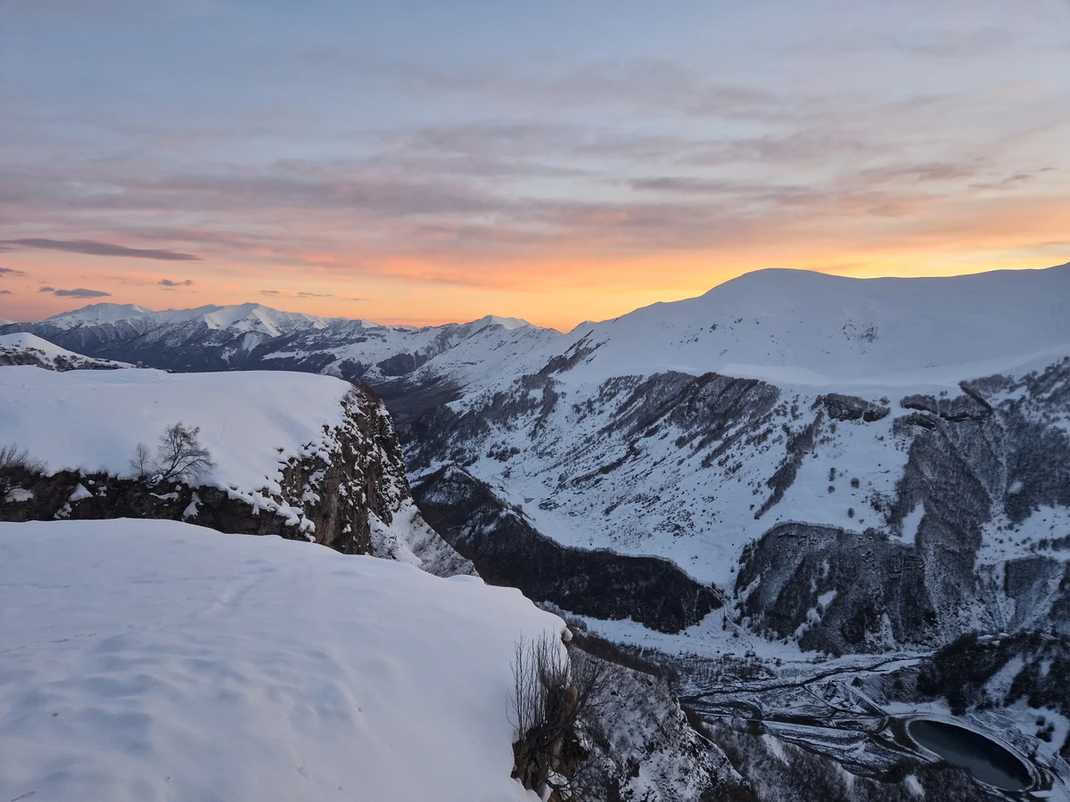 Жинвальское водохранилище (20 мин). Между тремя хребтами вы увидите водоём, который снабжает Тбилиси питьевой водой.