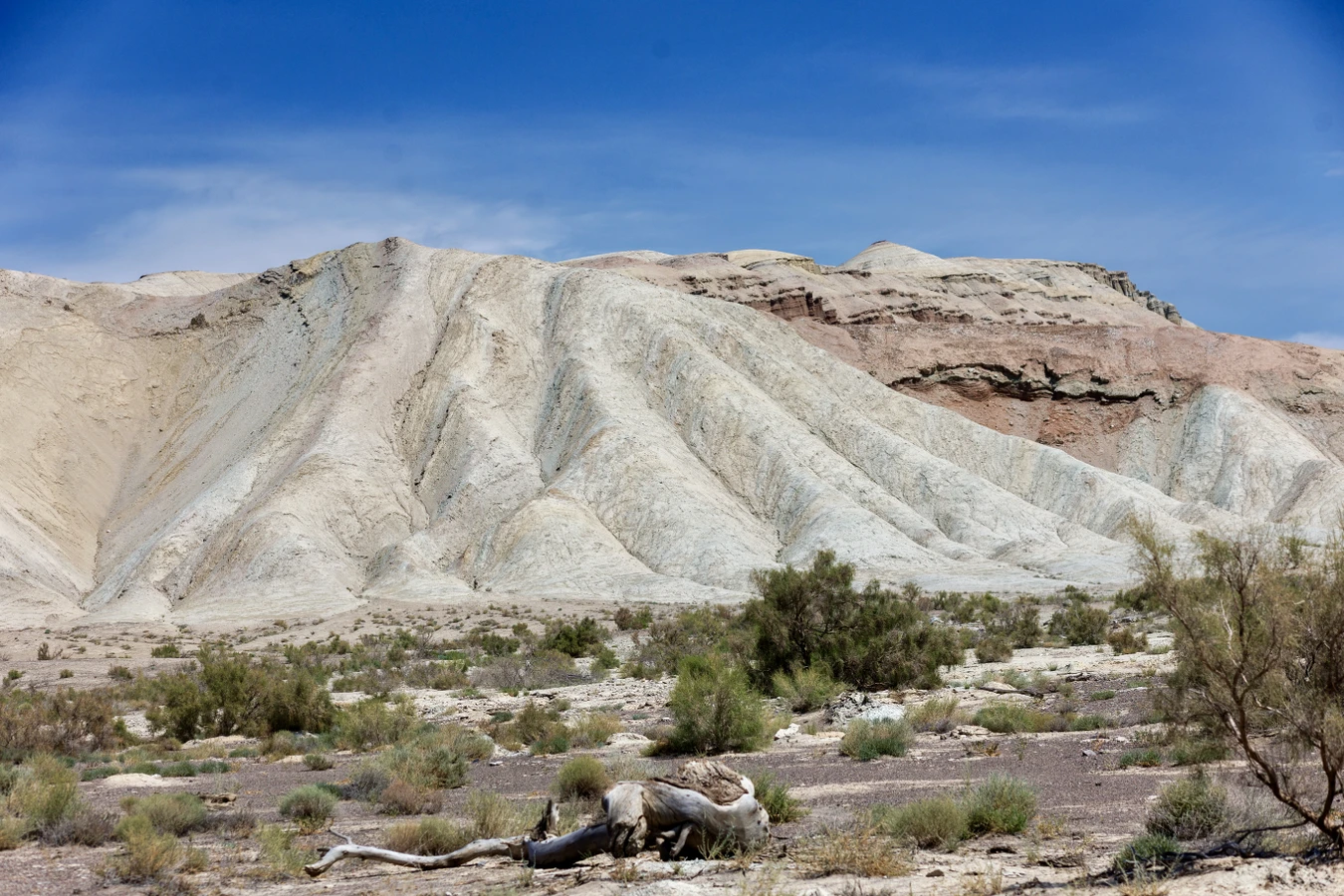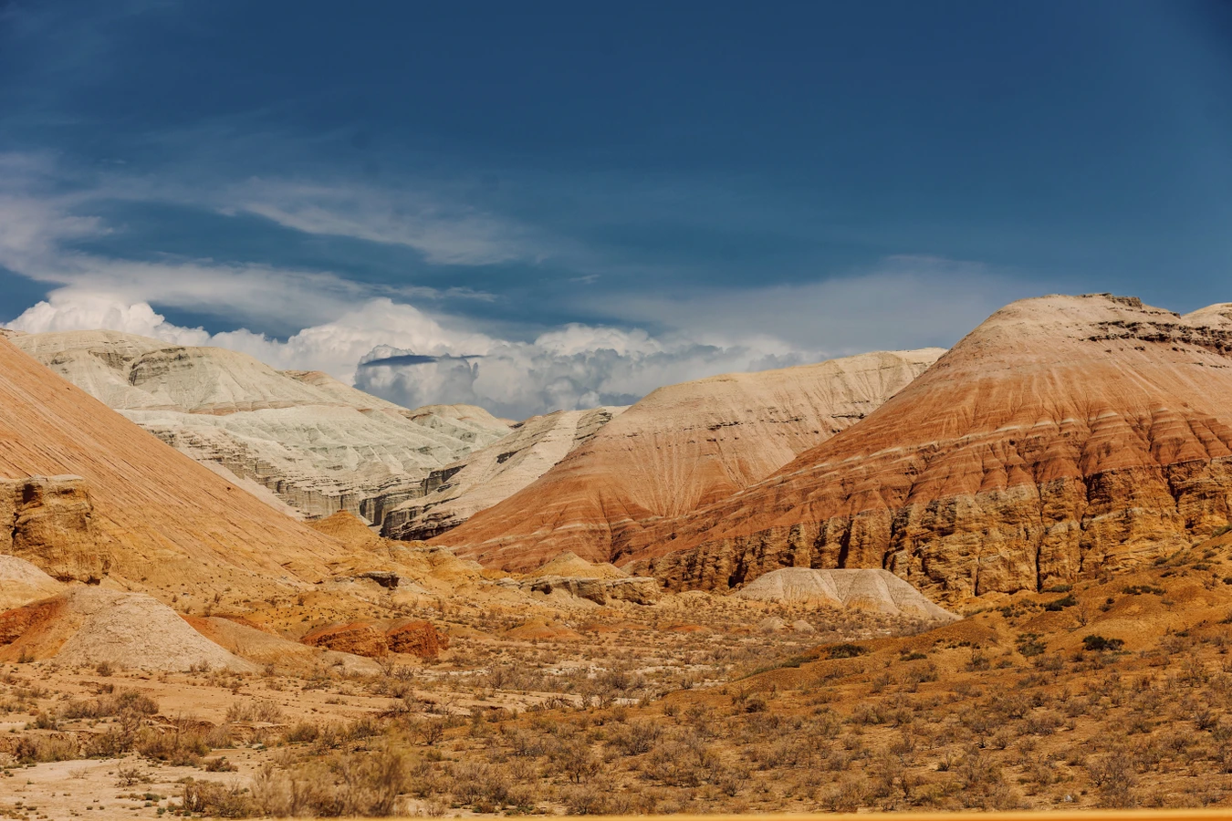 Перед вами — разноцветные меловые горы, сложенные из осадочных пород. Склоны переливаются белыми, розовыми, красными, жёлтыми и зелёными оттенками — словно слои огромного геологического пирога. Это один из самых узнаваемых и фотогеничных ландшафтов всего Алтын-Эмеля.