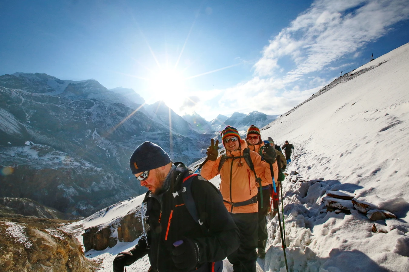 Температура на маршруте днём, под солнцем, достигает +25. После обеда, когда солнце прячется за горами, температура начинает падать до +5-10. На перевале Торонг Ла температура может опуститься до 0 или -5.