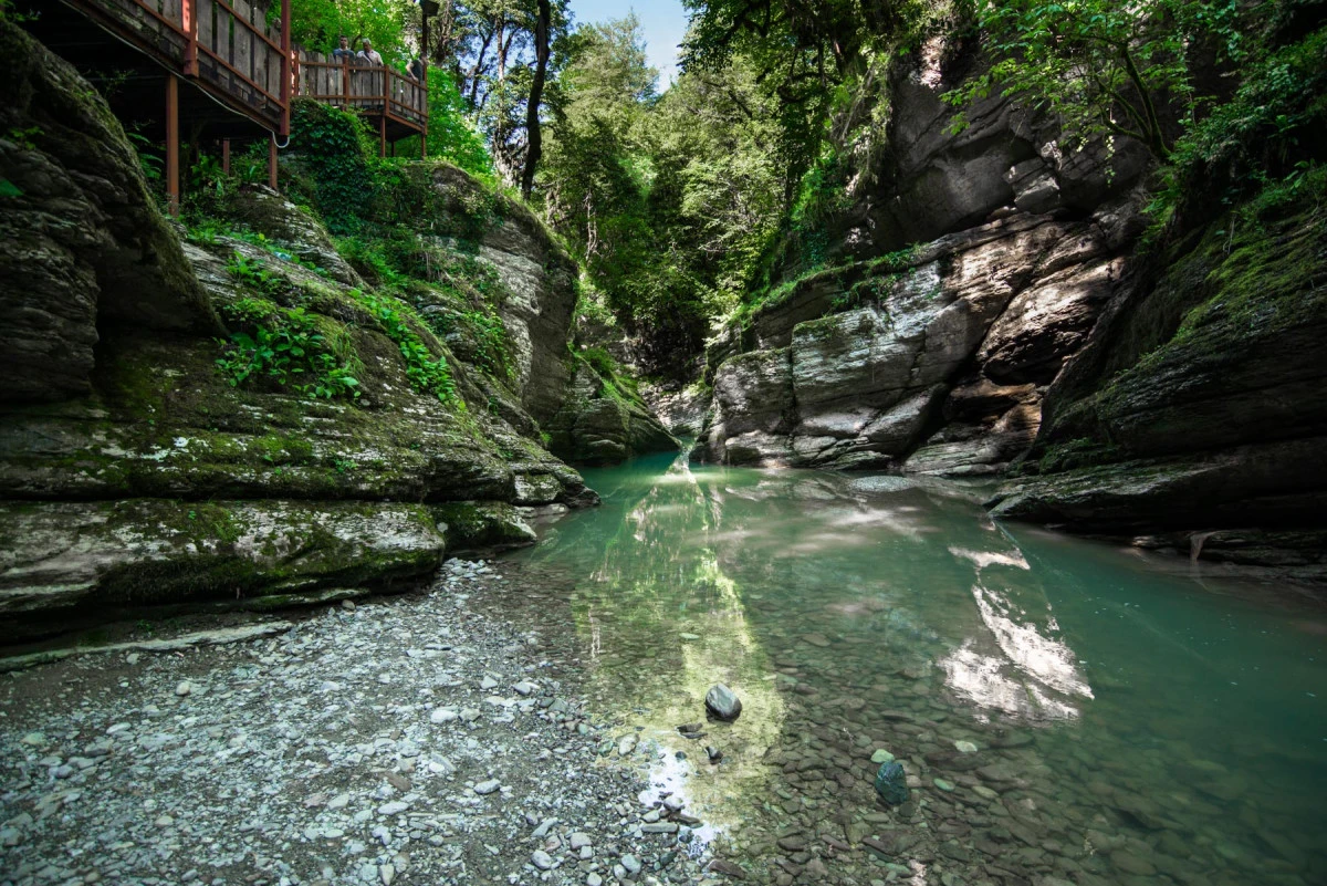 Два каньона Псахо и Кудепстинский каньон спрятаны в гуще колхидского самшитового леса. Поросшие мхом стволы древних самшитов, высокие буки, белые известняковые скалы над бирюзовой водой — всё это создает атмосферу волшебной сказки.