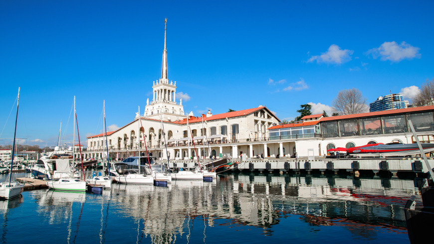 В морском порту Сочи. Живописная набережная и белоснежные яхты создают романтический колорит. Пройдете по территории, полюбуетесь великолепным архитектурным стилем главного здания морпорта и пополните коллекцию панорамными фотографиями визитной карточки Сочи.