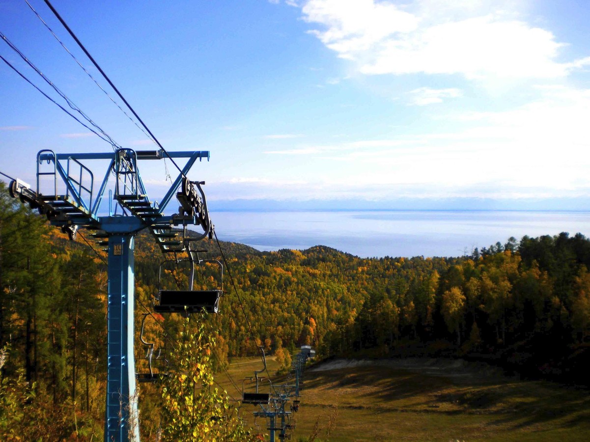Канатная дорога. Мы поднимемся на высоту 728 метров над Байкалом. Отсюда открывается панорама на озеро, исток Ангары и корпус астрофизической обсерватории.