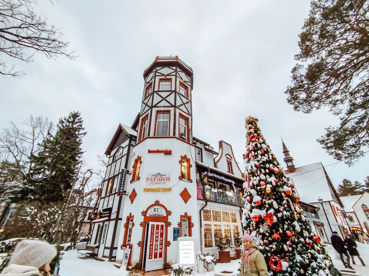 Затем наш путь лежит в Зеленоградск — в новогодние праздники он особенно хорош: улицы украшают гирляндами, а кафе и виллы соревнуются в конкурсе «Зеленоградское сияние».