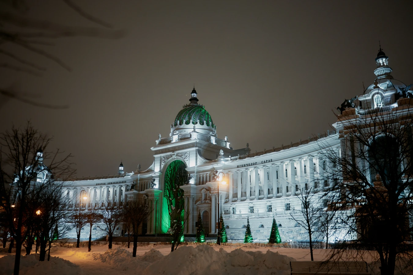 - Начнём с главного — «Игенчеләр сарае», или Дворца земледельцев. Ночью его украшает белая подсветка, а дерево подсвечивается зелёным. Рядом вы увидите ЖК «Дворцовая набережная» в том же стиле