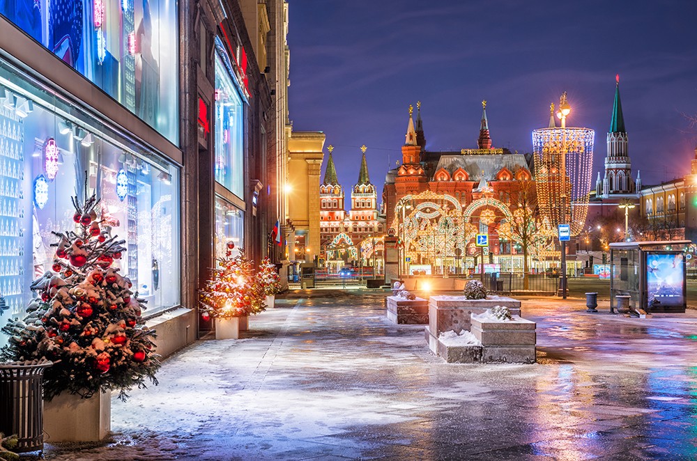 - Окунетесь в сказочную атмосферу Красной площади: рассмотрите нарядный ГУМ, главную елочку и место, откуда записывались некоторые новогодние обращения президентов России;