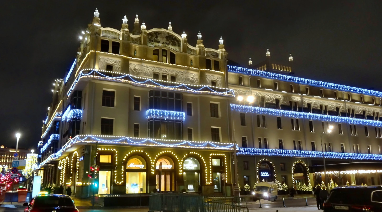 - Дом Благородного собрания, где отмечали Новый год дворяне. Поднявшись по Большой Дмитровке, вы увидите здание Нового Манежа и узнаете, как оно было связано с праздничной иллюминацией