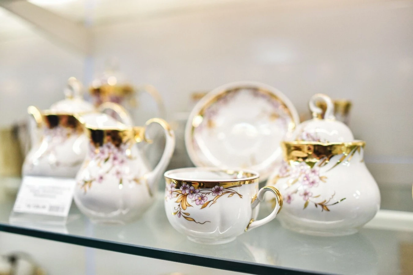На его полках можно найти разные предметы, созданные дулёвскими мастерами — сахарницы, чайники, сухарницы и даже бабушкины золочёные сервизы.