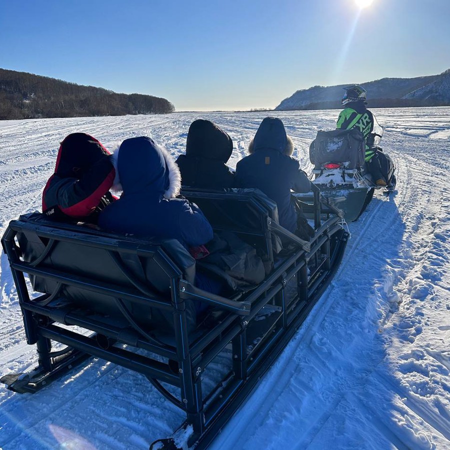 11:00 — приезжаем к месту пересадки на снегоходы, выдаём при необходимости тёплые сапоги, куртки, балаклавы, маски, проводим инструктаж по технике безопасности