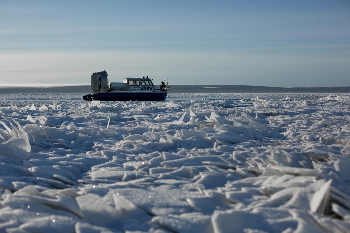 Вы прокатитесь по Онежскому озеру на катере-амфибии на воздушной подушке с тёплой закрытой кабиной — он уверенно передвигается по ледяной поверхности и хорошо защищает от ветра.