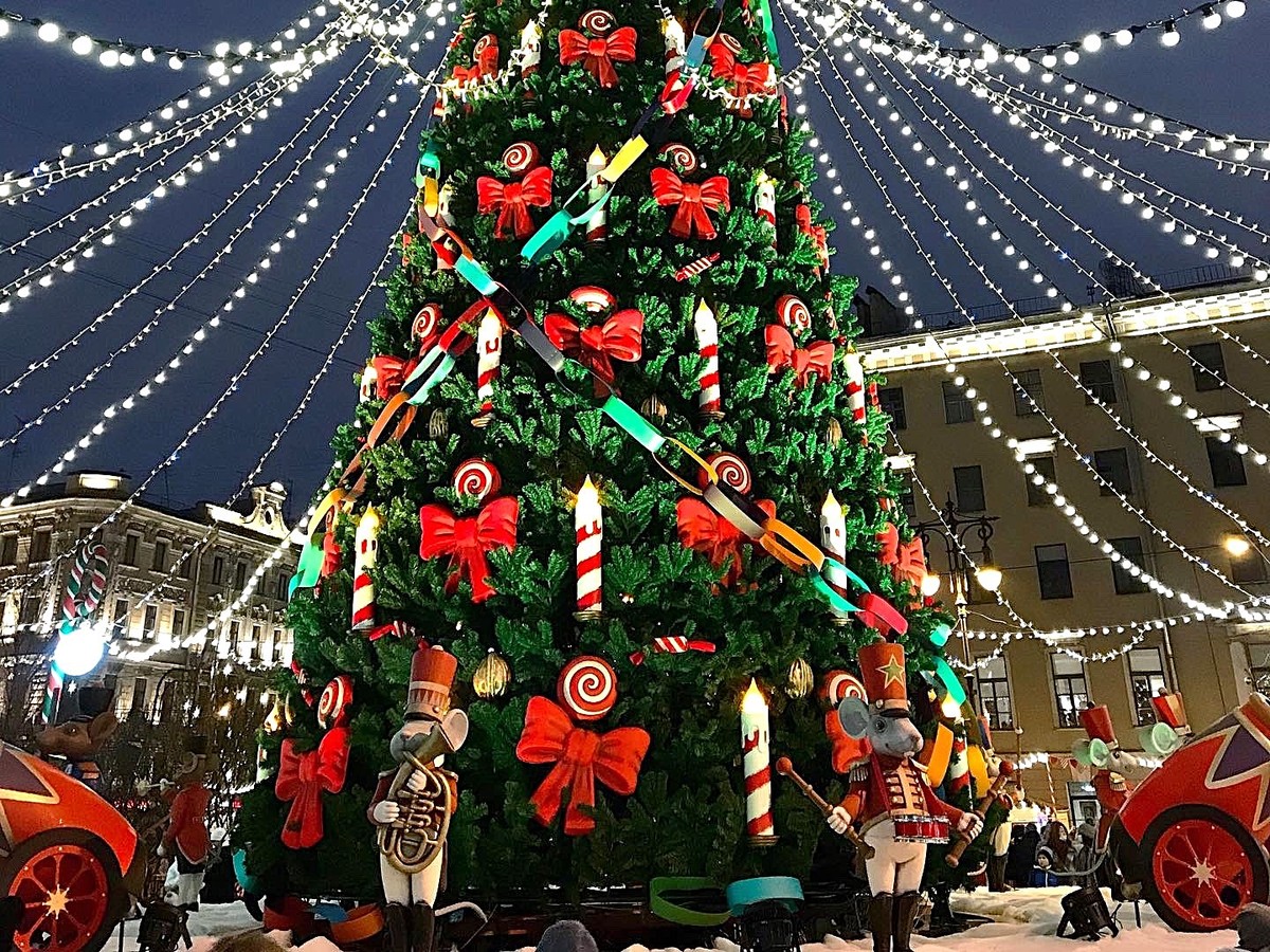 - Экскурсия начнётся на Дворцовой площади, где установлена главная ёлка города