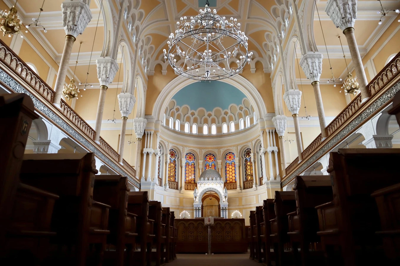 Главный молельный зал — роскошное пространство с арочными сводами, витражами и изящной лепниной.