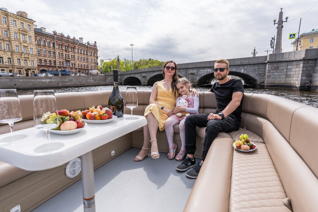 Прогулка на моторном катере. Этот формат предназначен для семьи или компании друзей. На катере есть все необходимое: столик, удобные мягкие диваны, расположенные по всему периметру судна, пледы, а также тент на случай дождя или яркого солнца. Катер полностью открытый, поэтому ничто не помещает вам рассмотреть красоты города.