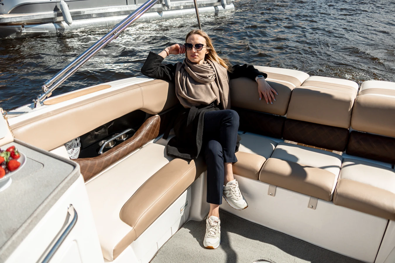 - На катере есть комфортабельные диваны, стол, туалетная комната, аудиосистема и пледы