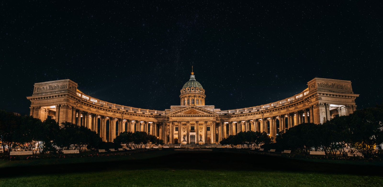 - Исаакиевская площадь с величественным Исаакиевским собором — в вечернем освещении монументальный комплекс с золотыми куполами выглядит особенно впечатляюще
