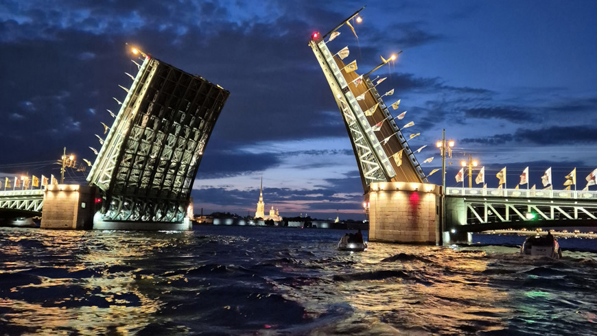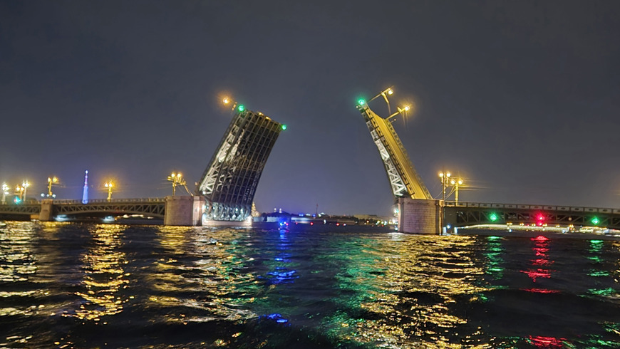 - Прохождение всех ключевых разводных мостов: Дворцовый, Троицкий, Благовещенский.
