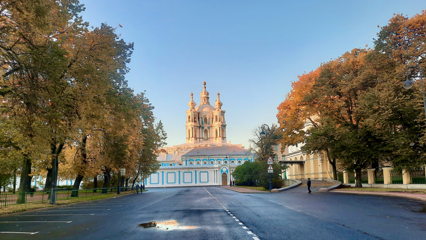 - Смольный монастырь - жилые корпуса и внутренние дворы. Смольный собор снаружи и внутри + звонница и подцерковье собора, правительственное здание Смольного, Большеохтинский мост, Охтинский мыс, сад-партер Смольного.