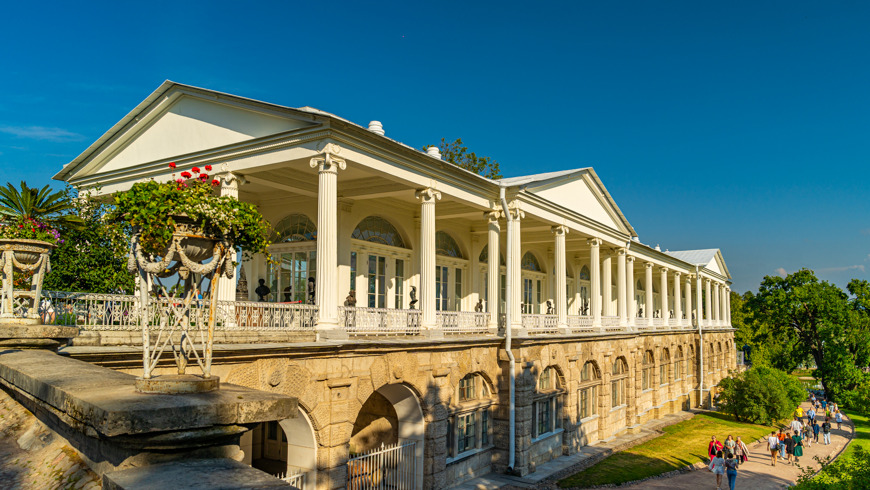 - Павильон Эрмитаж — уединённое место отдыха императорской семьи Грот — таинственное сооружение с морскими мотивами Камеронова галерея — образец палладианского стиля Агатовые комнаты — уникальное творение мастеров Французский парк — образец геометрической планировки Английский парк — воплощение природной гармонии Турецкая баня — экзотический павильон в мавританском стиле