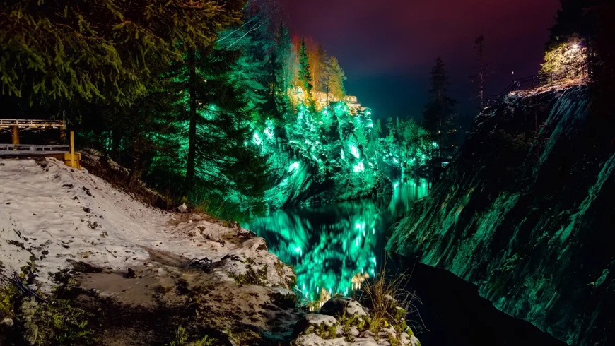 Прекрасная возможность за один день окунуться в атмосферу зимней сказки и увидеть настоящее сокровище Карелии – горный парк «Рускеала»! Волшебство цветных огней на мраморных скалах в окружении неповторимой северной природы подарит вам незабываемые впечатления! Маршрут продуман таким образом, чтобы дорога не была утомительной, а вы познакомились с самыми знаковыми местами региона.