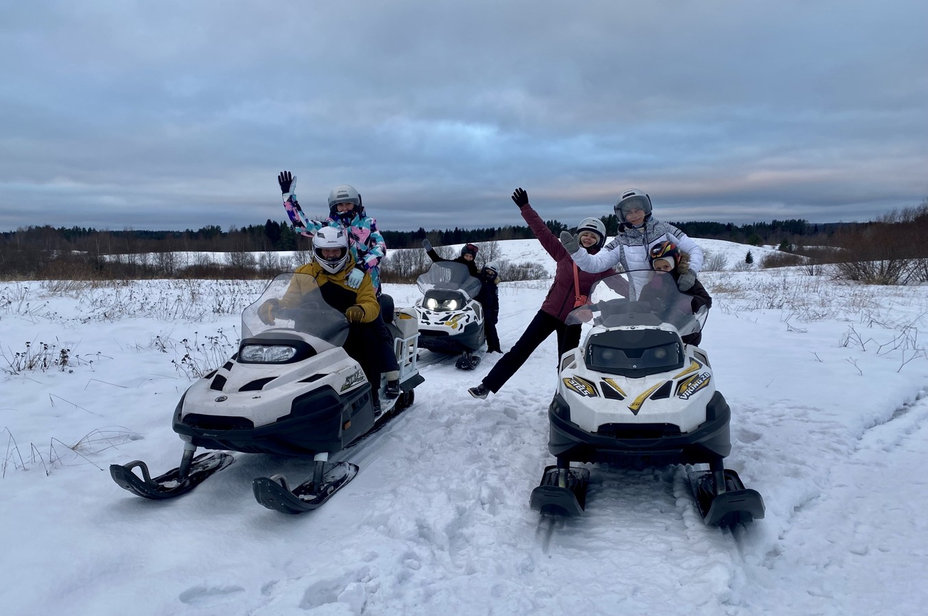 - На снегоходе могут ехать двое взрослых и ребёнок до 10 лет