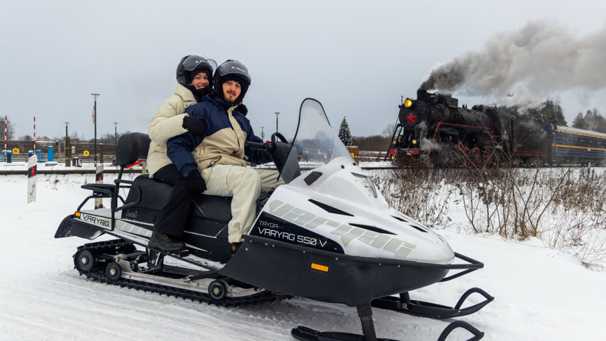 Уникальность зимней природы Карелии заключается в контрасте между суровой погодой и красотой заснеженных пейзажей. Прогулка на снегоходе подарит вам ощущение драйва, скорости, свободы, поможет освоить и покорить снежную машину, увидеть красоту зимней Карелии — лесов, снежных просторов с пушистым снегом. А ЕЩЕ- наша классная фишка - сверкающий поезд Деда Мороза, рядом с которым проходит маршрут, и впечатляющий паровоз - "Рускеальский экспресс", который мчится, выпуская клубы пара-он часто встречается путешественникам на их пути! На прогулку вы отправитесь на снегоходе ТАЙГА ВАРЯГ. Характеристики: Тайга Варяг 550v — новый большой российский двухместный снегоход, мощностью 55 л.с. Данная модель снегохода обладает широкой гусеницей, что обеспечивает максимальную устойчивость при маневрах, а также гарантирует высокий уровень проходимости по любому рельефу. Благодаря большим габаритам снегохода на нем комфортно смогут разместиться 2 человека, для пассажира установлена спинка сидения с ручками. Для водителя предусмотрен обогрев рукояток руля и курка газа. Имеется ограничение по весу пассажиров — не более 180 кг!