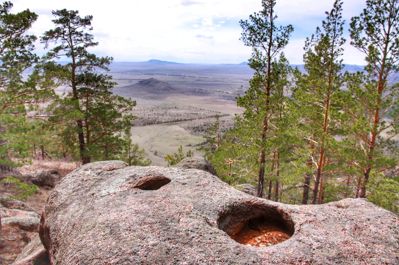 Это не здание за высокими стенами, а горы высотой около 500 метров, куда нам предстоит подняться. Ограждениями на тропе выступают скалы, торчащие из земли или сложенные из плоских валунов, и пещеры, в которых жили меркиты. Путь к вершине обрамляет реликтовая роща Чингисхана: это единственное место в Бурятии, где растут дикие сибирские абрикосы.