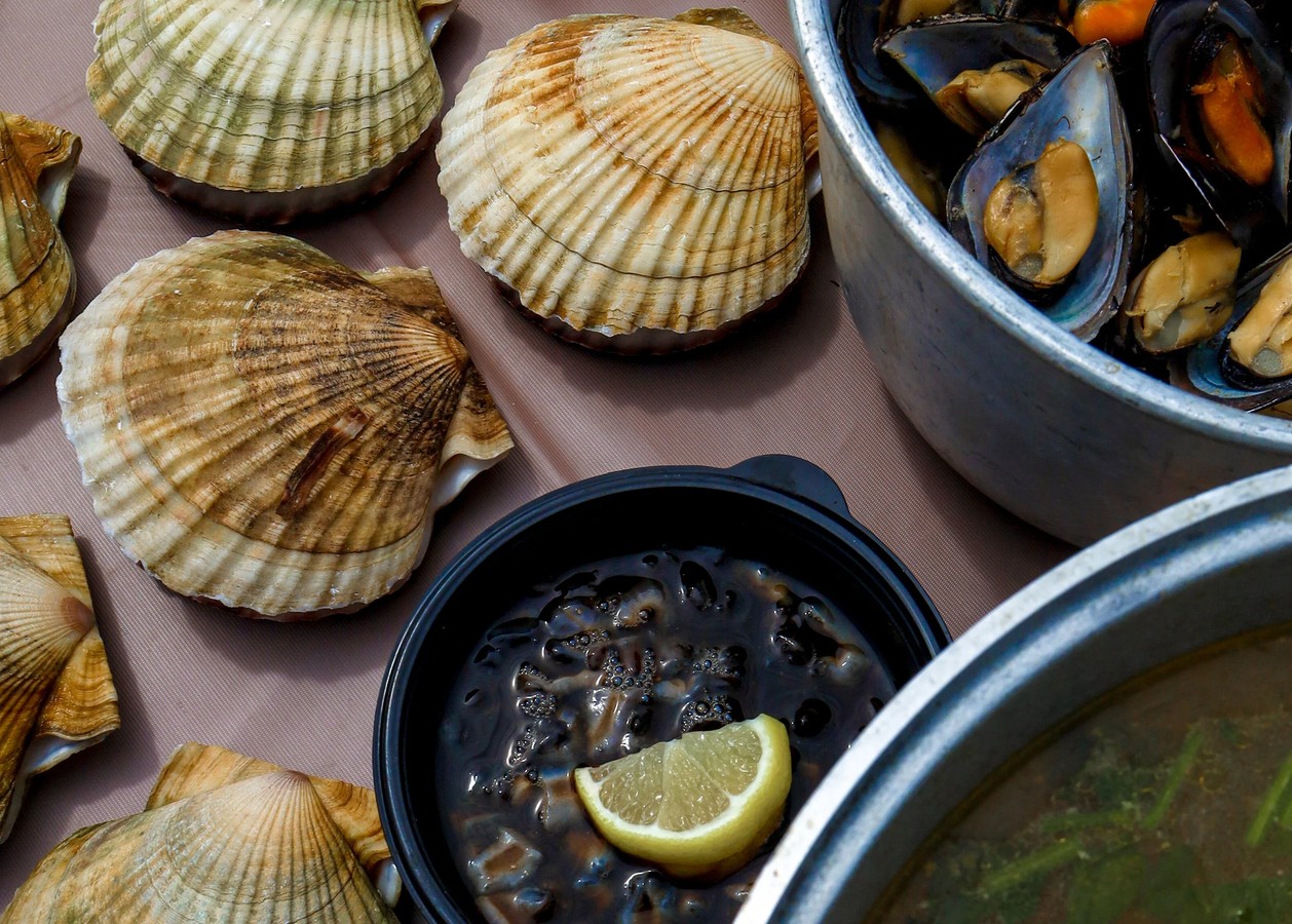 К горячему на закуску будут гребешки, устрицы, морские ежи и мидии (по сезону) — эти продукты можно есть сырыми. А дополнит обед бокал белого сухого вина.