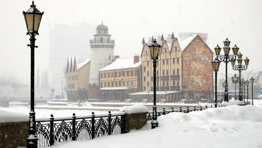 Посмотрим на скульптуру «Борющиеся зубры» и здание бывшего вокзала «Кранц». Увидим здание синагоги, Кафедральный собор, комплекс «Рыбная деревня», немецкую телефонную станцию и самый древний герб города Кенигсберг на здании.