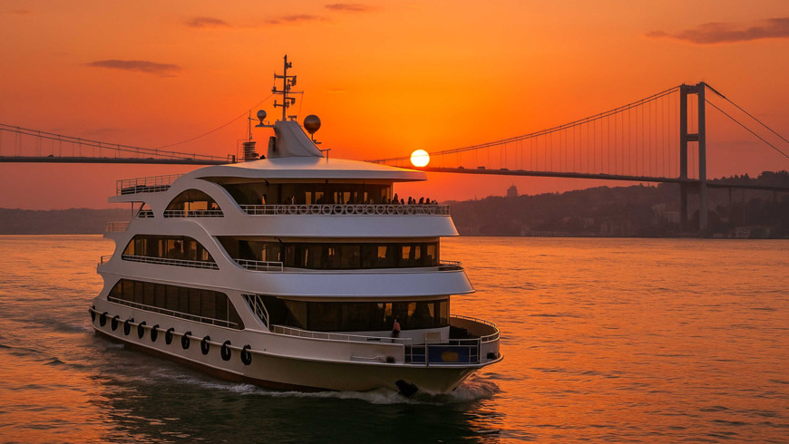 Вас ждёт закатный круиз по Босфору — лучшему времени суток, когда город выглядит максимально эффектно. Закат подсвечивает дворцы, мечети и мосты золотым светом, а огни вечернего Стамбула создают идеальную атмосферу для фото и видео.