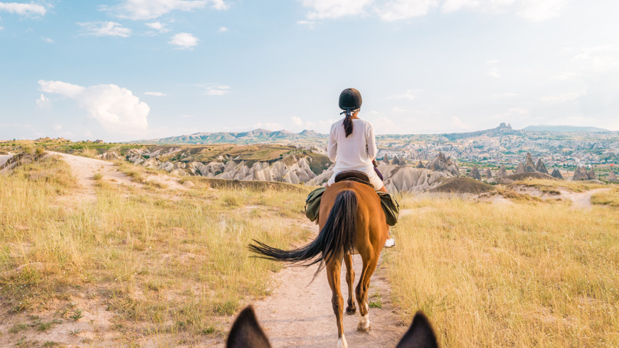 Мягкий свет рассвета или заката, ритмичный стук копыт и космические пейзажи Каппадокии — такая конная прогулка запомнится надолго. Вы окажетесь там, куда не добираются машины и пешие туристы, увидите Чавушин и знаменитые долины Мечей, Любви и Розовую. Это возможность подружиться с символом «Страны прекрасных лошадей» и почувствовать настоящую свободу.